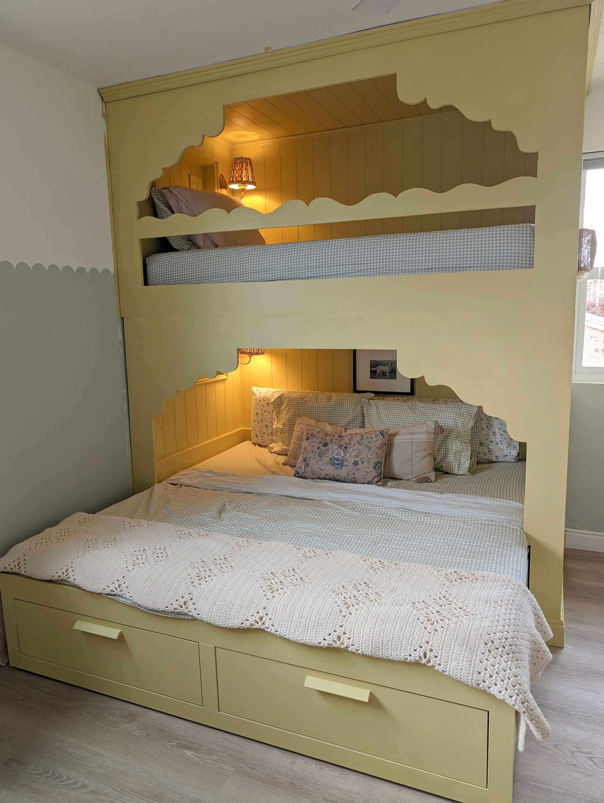 I also love that the bottom bunk pulls out to a king which we’ve slept on and is roomy and cozy! We used the Ikea BRIMNES pull-out bed as our base and love that it can pull out and be a king bed instead of a trundle with two twins.