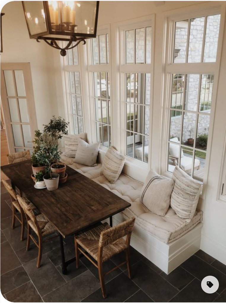 I’d like to have a long built in bench along the wall with a long wooden table and chairs surrounding it! I’m so excited to have it all open right off the kitchen to be able to cook and have somewhere for company in the same space!